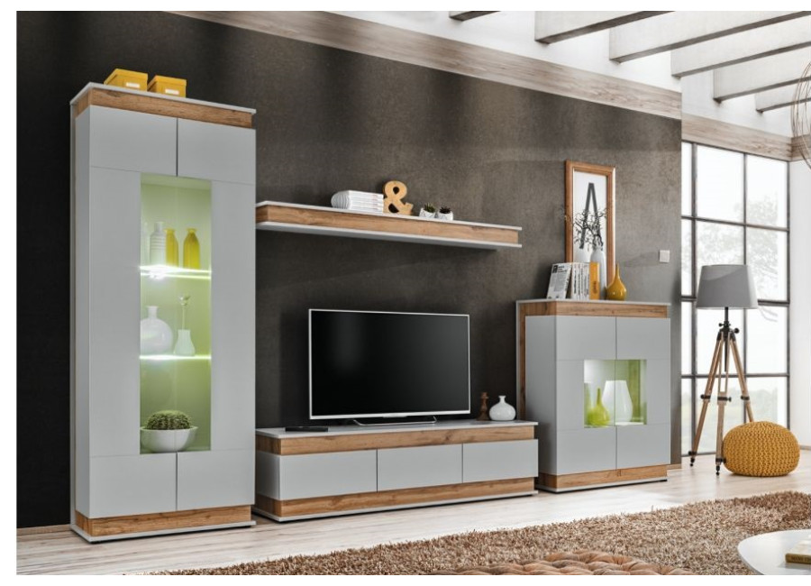 Obývacia stena BERLIN sa vyrába z kvalitnej laminovanej drevotriesky vo farbe Perla Gray a Dub Artisan. Súčasťou vitrín je biele LED osvetlenie.