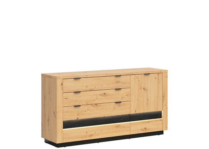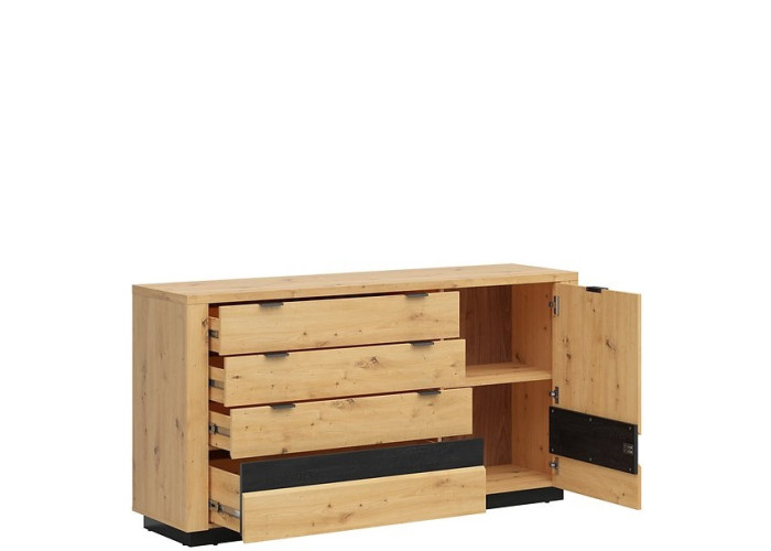 Kolekcia nábytku OSTIA zaujme minimalistickým úchytkami. Farebne kombinuje farbu dub artisan a dub čierny (vzor spálenej dosky), oceníte tiché zatváranie dvierok a zásuviek.