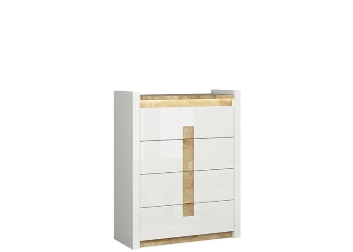 Nábytok ALAMEDA má moderný dizajn. Biela farba dvierok a korpusu je príjemne kombinovaná s doplnkami vo farbe a vzore dreva. Horná doska je podsvietená LEDkou.