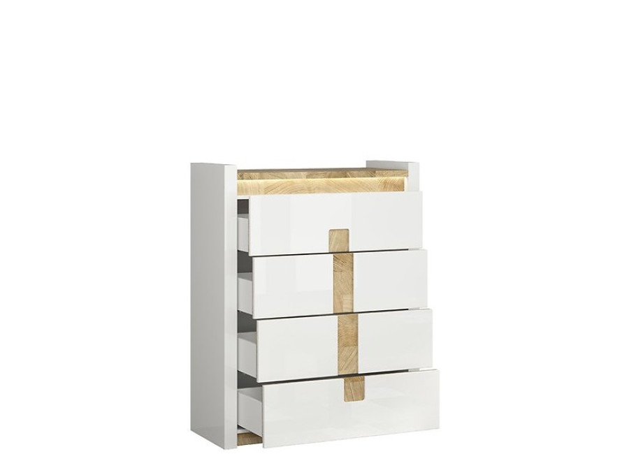 Nábytok ALAMEDA má moderný dizajn. Biela farba dvierok a korpusu je príjemne kombinovaná s doplnkami vo farbe a vzore dreva. Horná doska je podsvietená LEDkou.