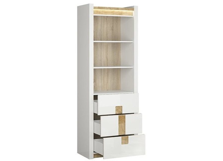 Nábytok ALAMEDA má moderný dizajn. Biela farba dvierok a korpusu je príjemne kombinovaná s doplnkami vo farbe a vzore dreva. Horná doska je podsvietená LEDkou.