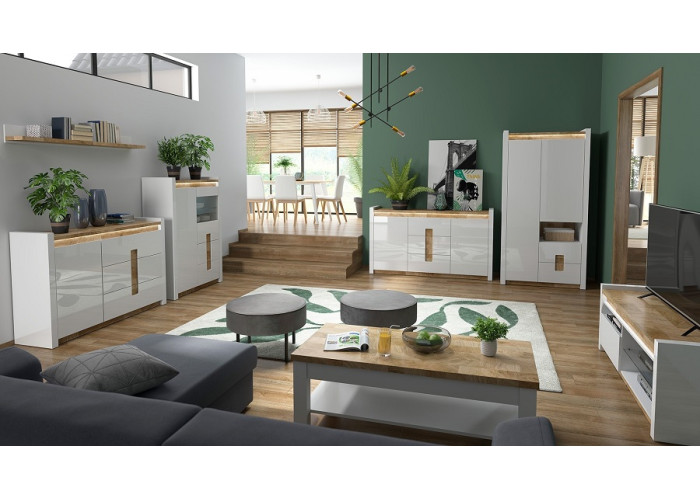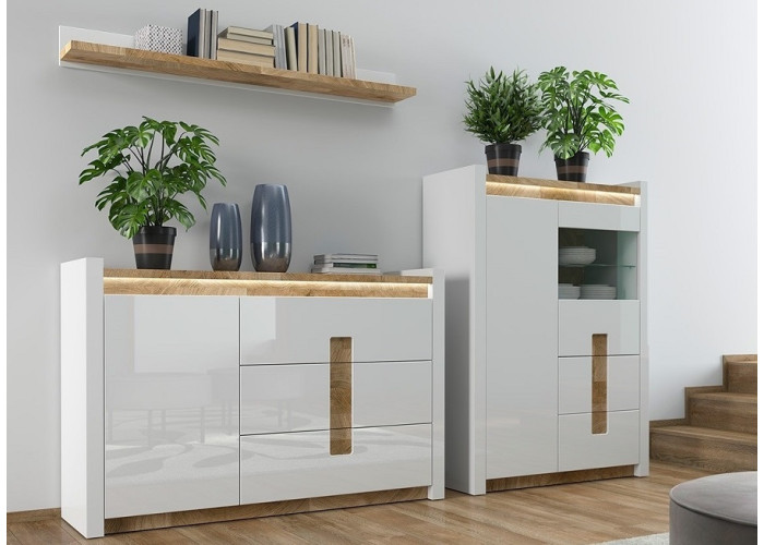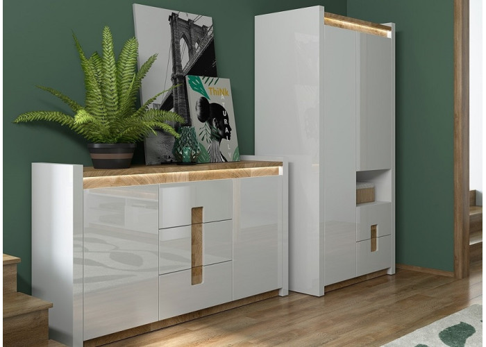 Nábytok ALAMEDA má moderný dizajn. Biela farba dvierok a korpusu je príjemne kombinovaná s doplnkami vo farbe a vzore dreva. Horná doska je podsvietená LEDkou.