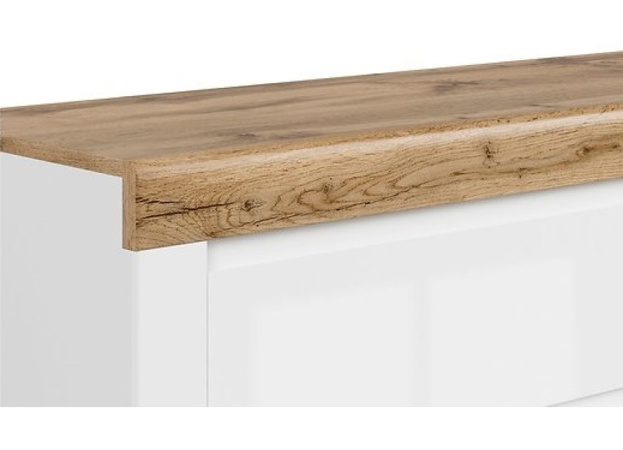 Kolekcia nábytku HOLTEN sa vyznačuje modernými tvarmi a dizajnom. Korpusy skriniek sú vyrobené v bielej matnej farbe v kombinácií s bielym leskom na dvierkach a predných plochách. Výrazným prvkom je horná doska s lištou, ktorá vytvára masívny vzhľad nábytku.