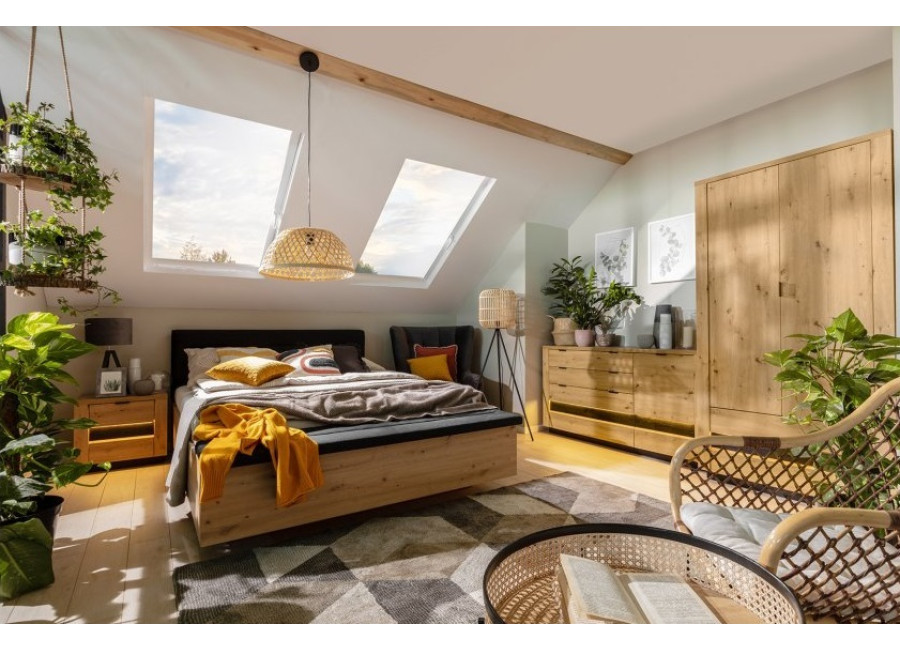 Kolekcia nábytku OSTIA zaujme minimalistickým úchytkami. Farebne kombinuje farbu dub artisan a dub čierny (vzor spálenej dosky), oceníte tiché zatváranie dvierok a zásuviek.