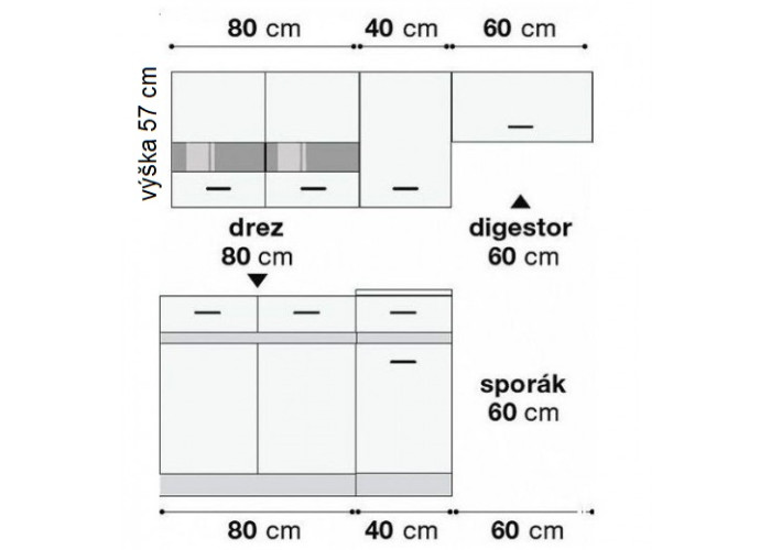 Moderná sektorová kuchynská zostava s drevotrieskovými dvierkami. Kuchyňa JUNONA je vhodná do malých a málo využívaných kuchynských priestorov. Výška horných skriniek je 57 cm. V cene je zahrnutá aj delená pracovná doska vo farbe Čiernozlatá bridlica v dĺžke 40 cm.