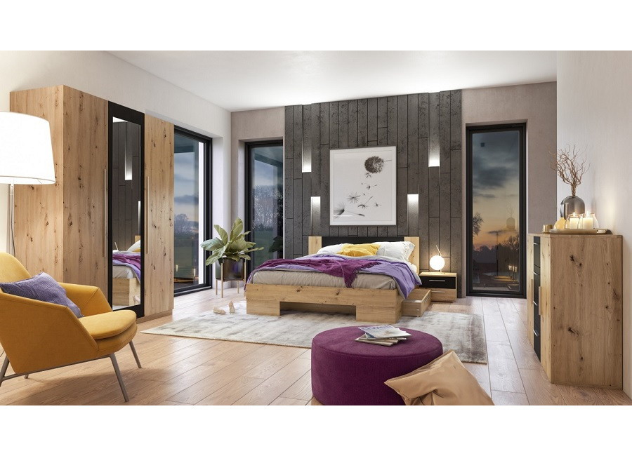 Spálňa VERA vo farebnom prevedení dub artisan/čierna výborne kombinuje funkčnosť a dizajn. Je vhodná do moderných interiérov, vybrať si môžete z niekoľkých sektorových prvkov.