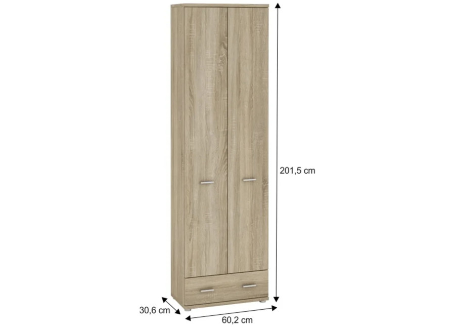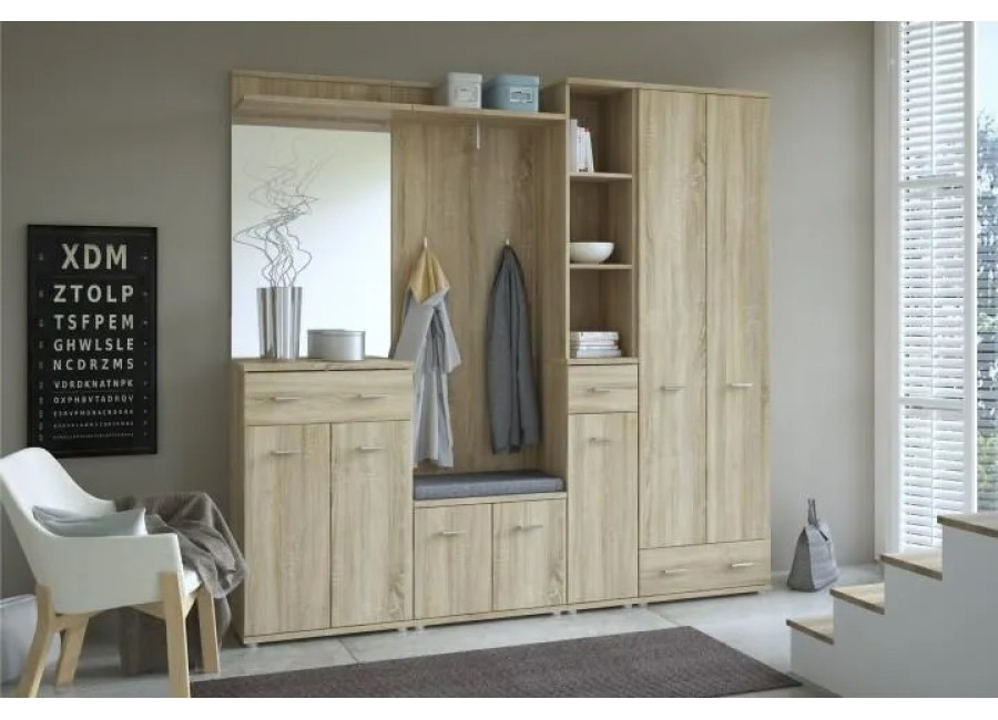 Jednoduchý nábytok do predsiene v obľúbenom farebnom prevedení dub sonoma. Skrinky majú malú hĺbku, je tak vhodný do menších predsiení a hál.
