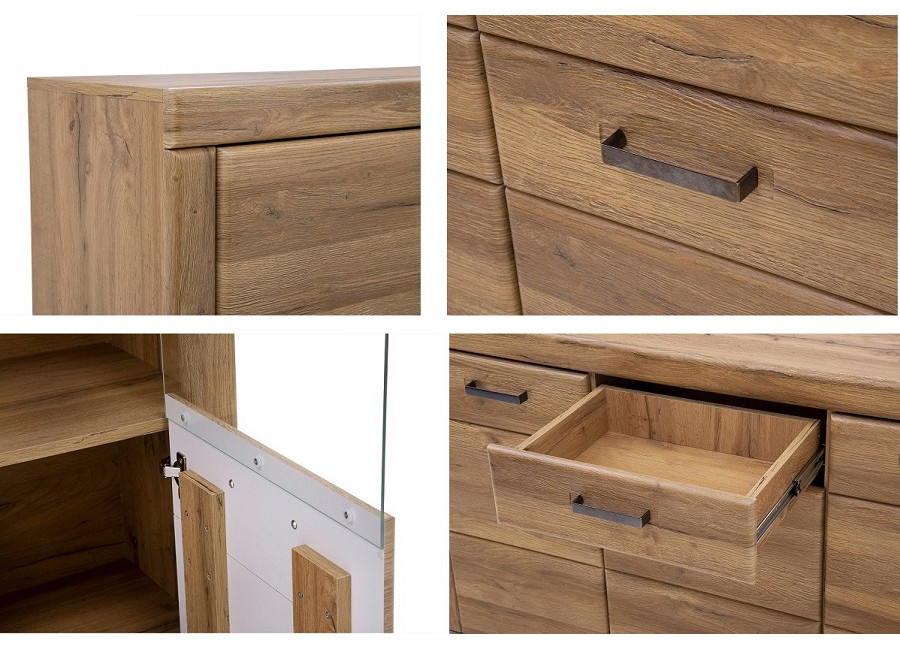 Sektorový nábytok PUSAN je elegantný systém na zariadenie obývacích izieb a jedálni s kovovými úchytkami. Vyrába sa z laminovanej drevotriesky.