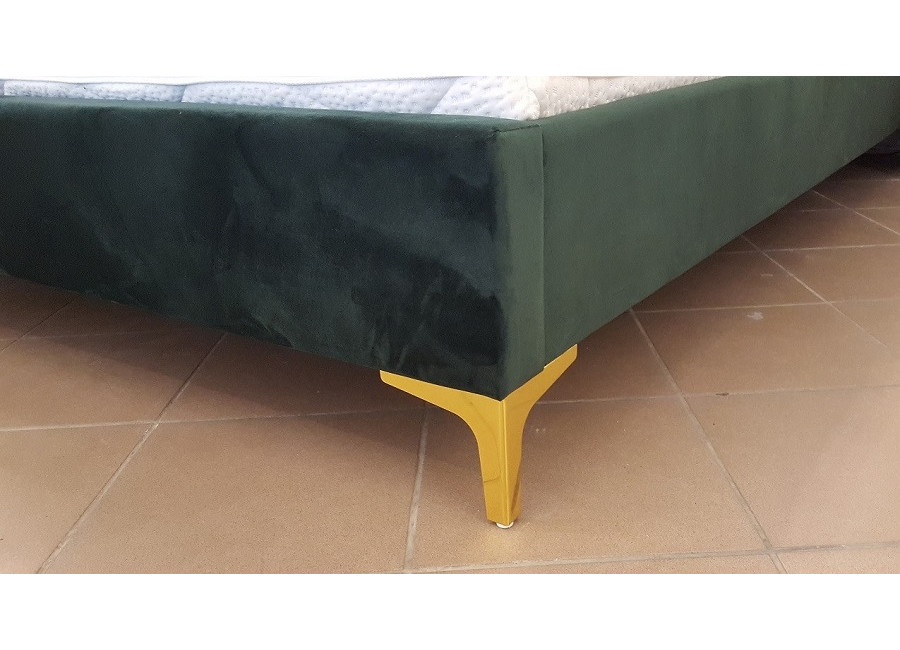 - Posteľ spočíva na kovových nožičkách v zlatej farbe.