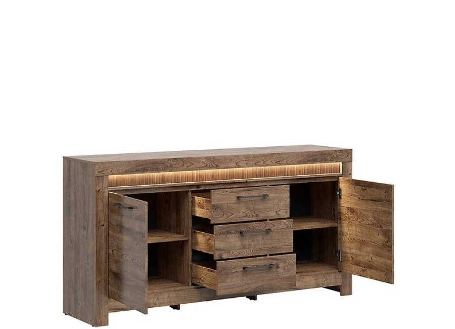 Majestátny a nadčasový dizajn kolekcie TORIN stanovuje nový trend v interiéroch. Ak sa Vám páčia zosilnené boky, pevné kovové rukoväte a intenzívne tmavá farba nábytku, tak získate, po čom túžite. LED osvetlenie umiestnené pod vrchnou doskou kladie dôraz na unikátny štýl. Oceníte aj tiché zatváranie dvierok a zásuviek.