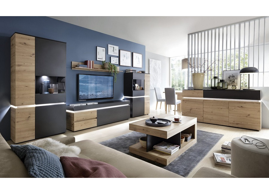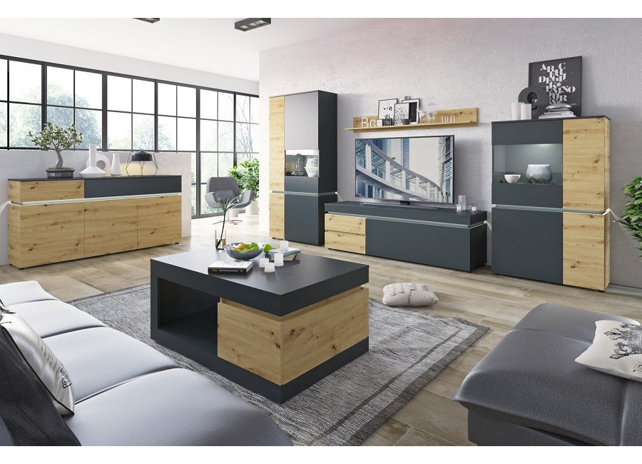 Sektorový nábytok MAGNUS Vás zaujme príjemnou farebnou kombináciou dubu artisan a sivej farby. Charakteristickým pre tento úžasný nábytok je luxusné vodorovné LED osvetlenie v cene, kvalitný materiál, praktické bez-úchytkové otváranie a tichý systém zatvárania dvierok a plnovýsuvné koľajničky na zásuvkách.
