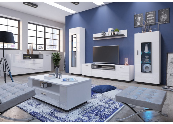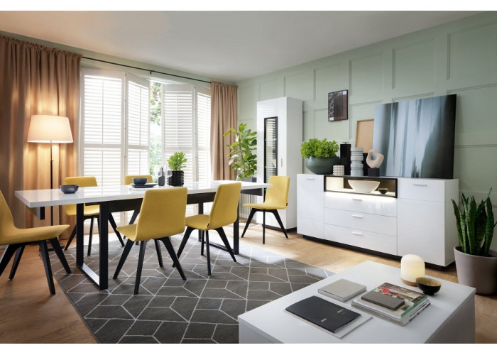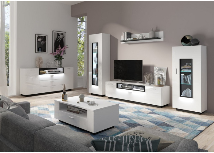 MARILLA je biely lesklý nábytok, pre ktorý sú charakteristické jemne vystupujúce čierne rámy, ktoré sú podsvietené LED svetlom. Štýlové vitríny sú miestom na vystavenenie zaujímavých doplnkov. Skrinky majú kovové úchytky.