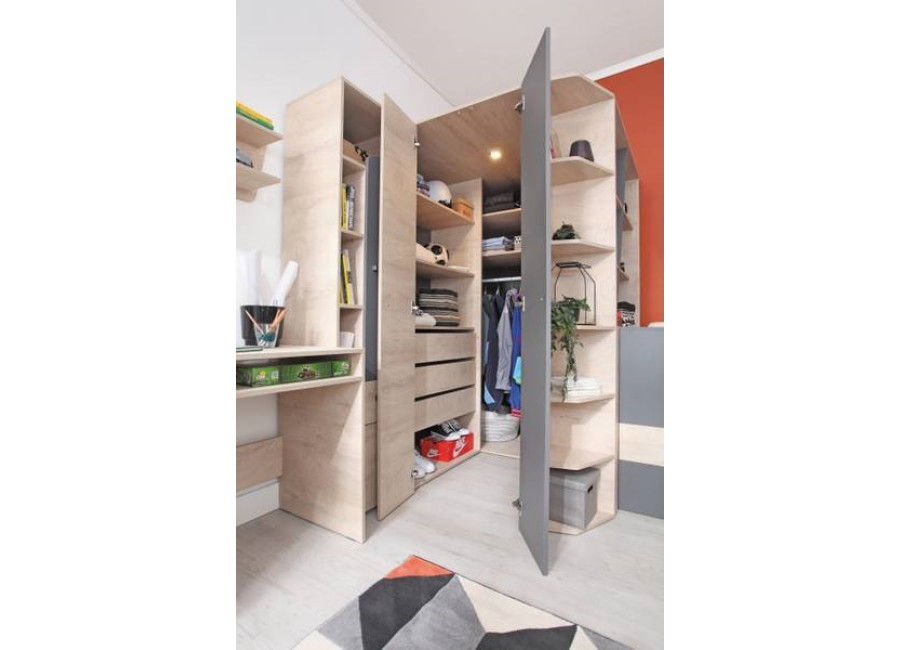 Sektorovým nábytkom DONA môžete zariadiť detskú aj študentskú izbu pre starších. Poskytuje veľa úložného priestoru na uloženie kníh, hračiek a oblečenia. Moderná kombinácia farieb vytvára v miestnosti útulnú a príjemnú atmosféru.