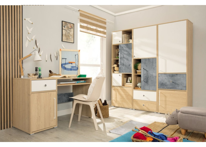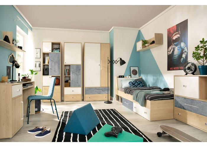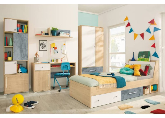 Sektorovým nábytkom SAFFI môžete zariadiť detskú aj študentskú izbu pre starších. Poskytuje veľa úložného priestoru na uloženie kníh, hračiek a oblečenia. Moderná kombinácia farieb vytvára v miestnosti útulnú a príjemnú atmosféru.