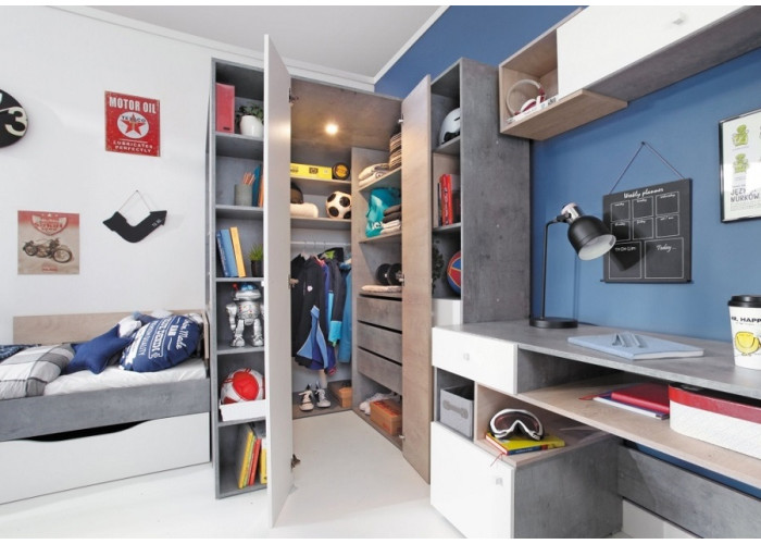 Sektorovým nábytkom SKIP biela/beton/dub môžete zariadiť detskú aj študentskú izbu pre starších. Poskytuje veľa úložného priestoru na uloženie kníh, hračiek a oblečenia. Moderná kombinácia farieb vytvára v miestnosti útulnú a príjemnú atmosféru.