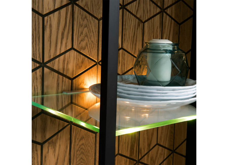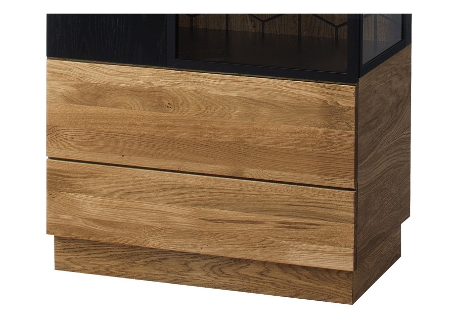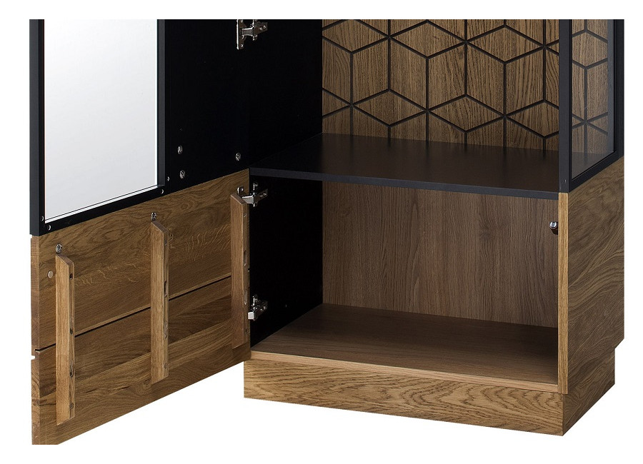 Luxusný masívny sektorový nábytok Mosaic je stelesnením luxusu a moderného dizajnu. Charakteristickým znakom je výrazná kresba dreva, v odtieni dub medový, v kombinácií s čiernou farbou a 3D vzorom kocky. Kovové úchyty v čiernej farbe len podčiarknu výnimočný dizajn.