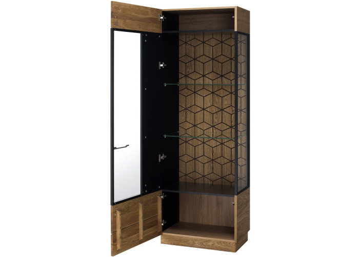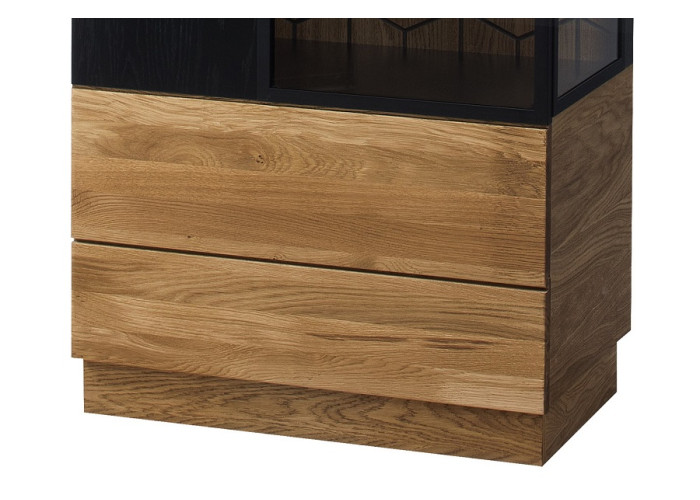 Luxusný masívny sektorový nábytok Mosaic je stelesnením luxusu a moderného dizajnu. Charakteristickým znakom je výrazná kresba dreva, v odtieni dub medový, v kombinácií s čiernou farbou a 3D vzorom kocky. Kovové úchyty v čiernej farbe len podčiarknu výnimočný dizajn.