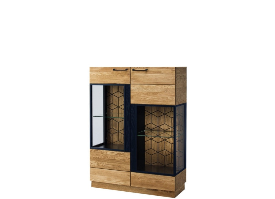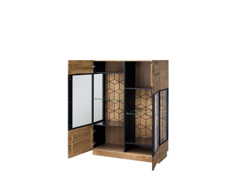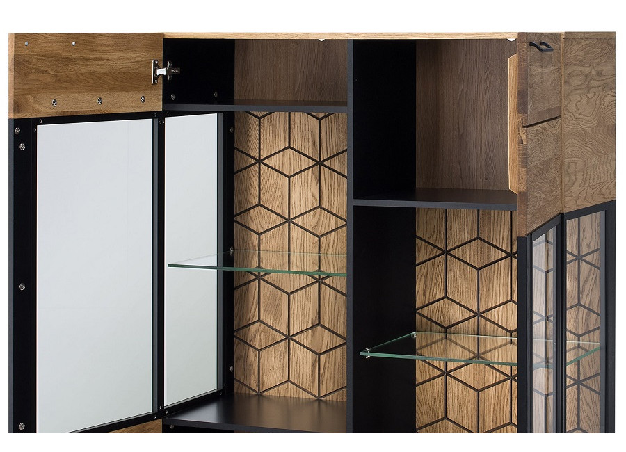Luxusný masívny sektorový nábytok Mosaic je stelesnením luxusu a moderného dizajnu. Charakteristickým znakom je výrazná kresba dreva, v odtieni dub medový, v kombinácií s čiernou farbou a 3D vzorom kocky. Kovové úchyty v čiernej farbe len podčiarknu výnimočný dizajn.