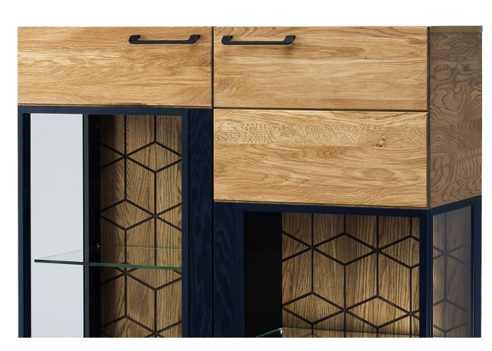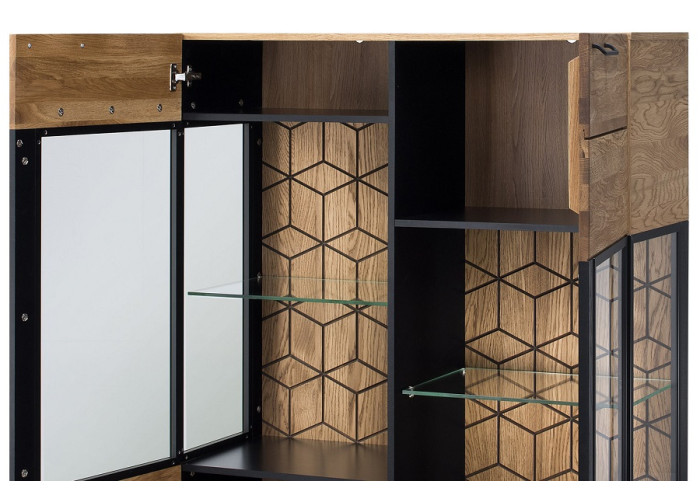 Luxusný masívny sektorový nábytok Mosaic je stelesnením luxusu a moderného dizajnu. Charakteristickým znakom je výrazná kresba dreva, v odtieni dub medový, v kombinácií s čiernou farbou a 3D vzorom kocky. Kovové úchyty v čiernej farbe len podčiarknu výnimočný dizajn.