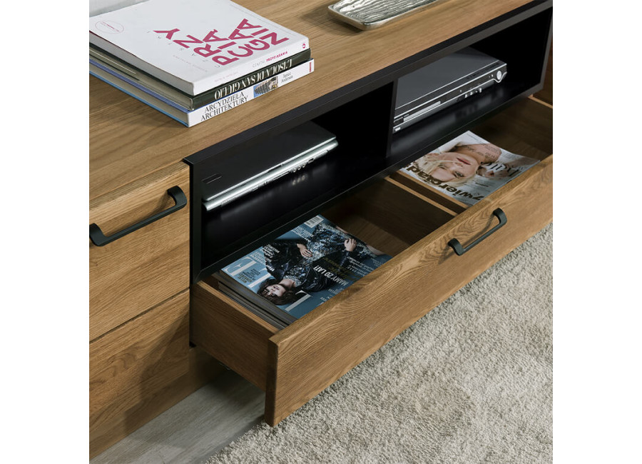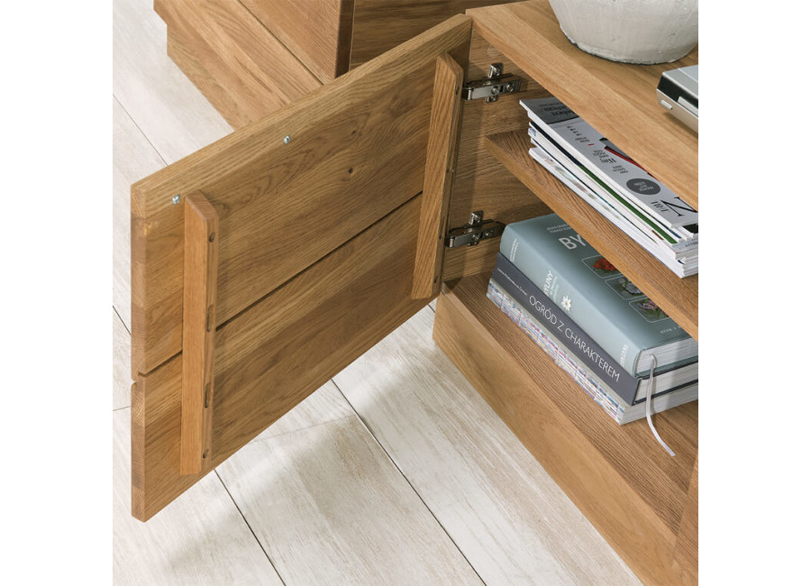 Luxusný masívny sektorový nábytok Mosaic je stelesnením luxusu a moderného dizajnu. Charakteristickým znakom je výrazná kresba dreva, v odtieni dub medový, v kombinácií s čiernou farbou a 3D vzorom kocky. Kovové úchyty v čiernej farbe len podčiarknu výnimočný dizajn.