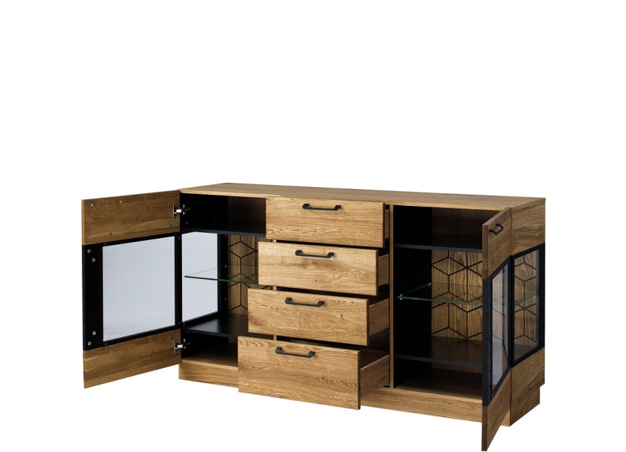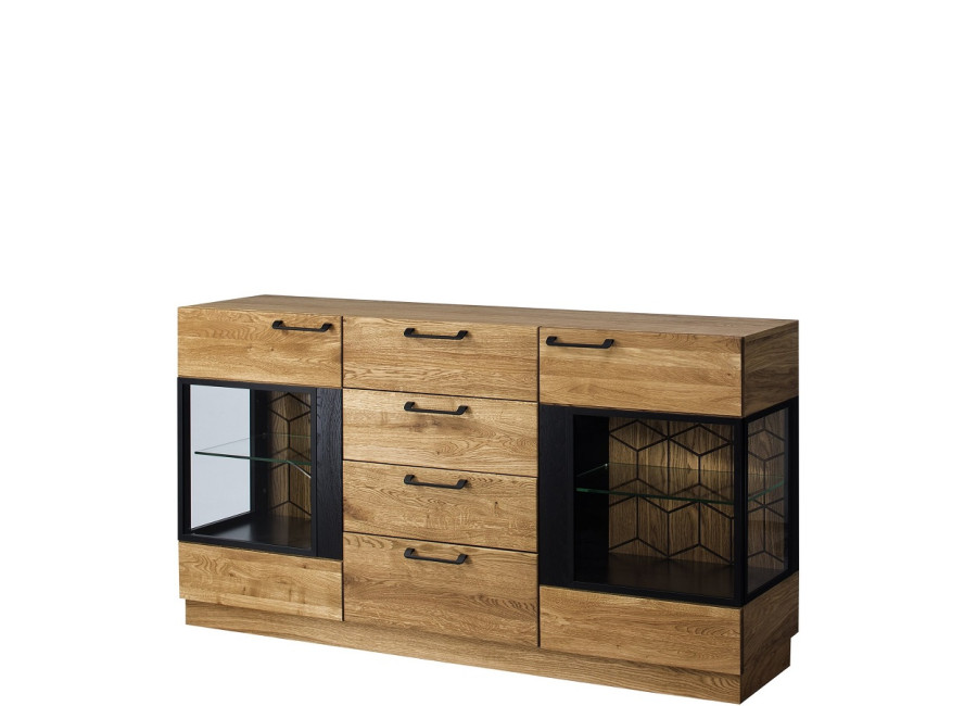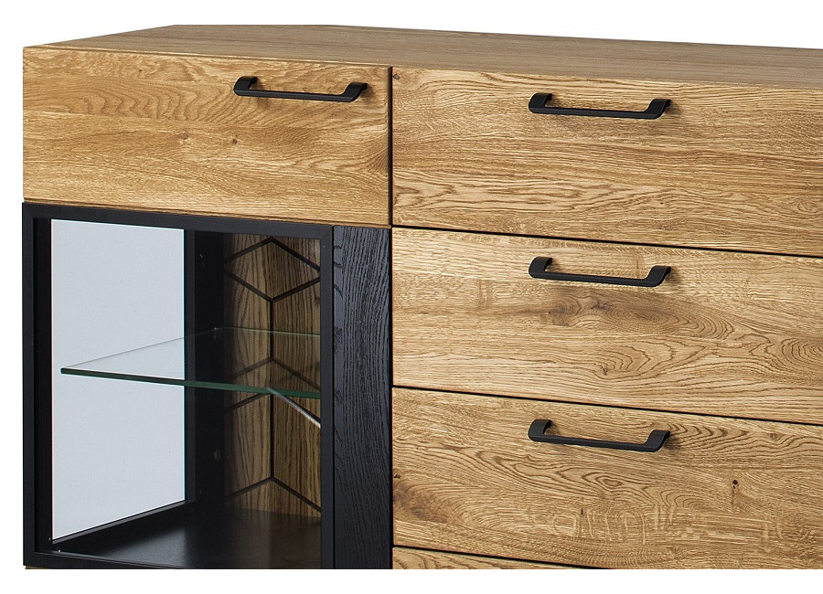 Luxusný masívny sektorový nábytok Mosaic je stelesnením luxusu a moderného dizajnu. Charakteristickým znakom je výrazná kresba dreva, v odtieni dub medový, v kombinácií s čiernou farbou a 3D vzorom kocky. Kovové úchyty v čiernej farbe len podčiarknu výnimočný dizajn.