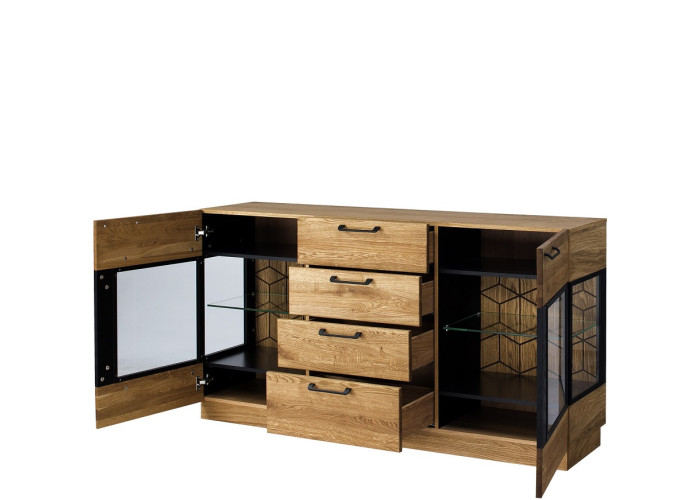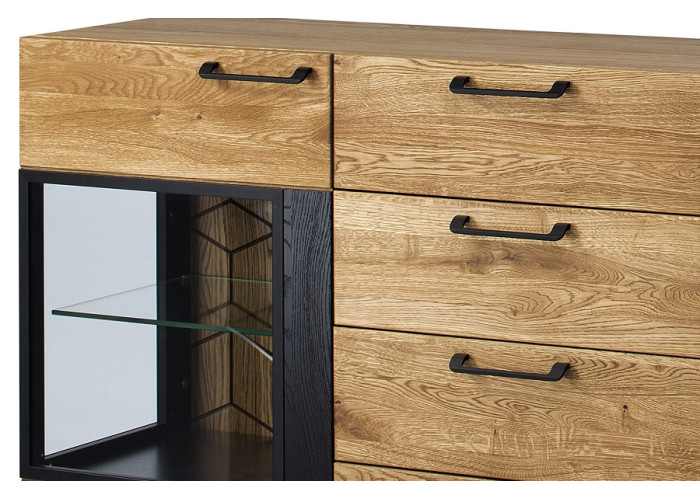 Luxusný masívny sektorový nábytok Mosaic je stelesnením luxusu a moderného dizajnu. Charakteristickým znakom je výrazná kresba dreva, v odtieni dub medový, v kombinácií s čiernou farbou a 3D vzorom kocky. Kovové úchyty v čiernej farbe len podčiarknu výnimočný dizajn.