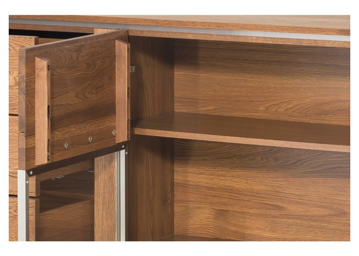 Predná časť (dvierka a čielka zásuviek) nábytku Montenegro je vyrobená z masívneho dreva, vonkajší korpus skriniek je z dubovej dýhy, vnútorná časť je vyrobená z drevotriesky, povrch je upravený ekologickým olejom, čo zabezpečuje zdravotnú nezávadnosť nábytku.