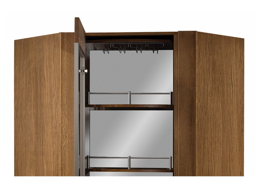 Vitrína slúži ako barová skrinka, má vo vrchnej časti otočné vnútro, z dvoch strán je zrkadlo, na tretej strane sú drevené police a na štvrtej strane je zrkadlo s kovovými poličkami na fľaše a poháre.