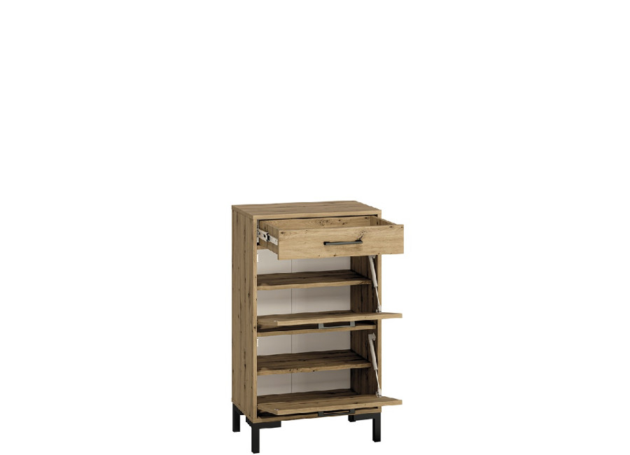 Nábytok NEVIO je moderná a elegantná kolekcia predsieňového nábytku. Výrazná kombinácia dubu artisan s čiernymi úchytkami a nožičkami je dokonalým riešením zariadenia chodby.