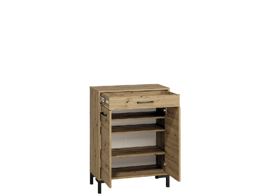 Nábytok NEVIO je moderná a elegantná kolekcia predsieňového nábytku. Výrazná kombinácia dubu artisan s čiernymi úchytkami a nožičkami je dokonalým riešením zariadenia chodby.