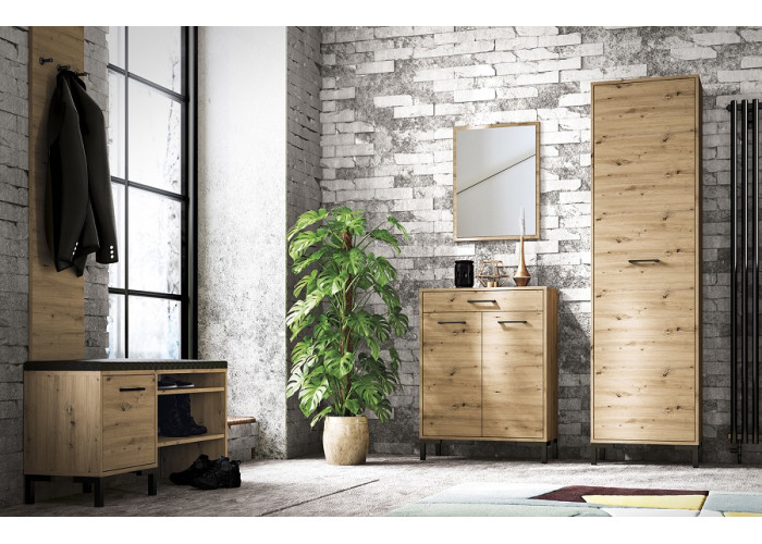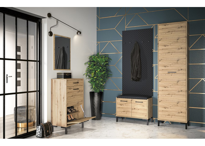 Nábytok NEVIO je moderná a elegantná kolekcia predsieňového nábytku. Výrazná kombinácia dubu artisan s čiernymi úchytkami a nožičkami je dokonalým riešením zariadenia chodby.