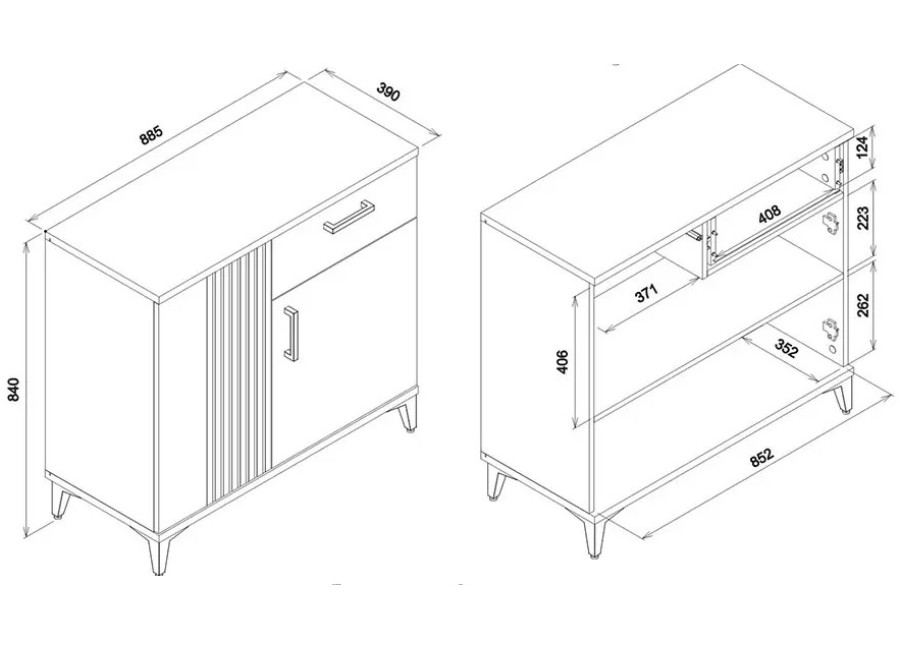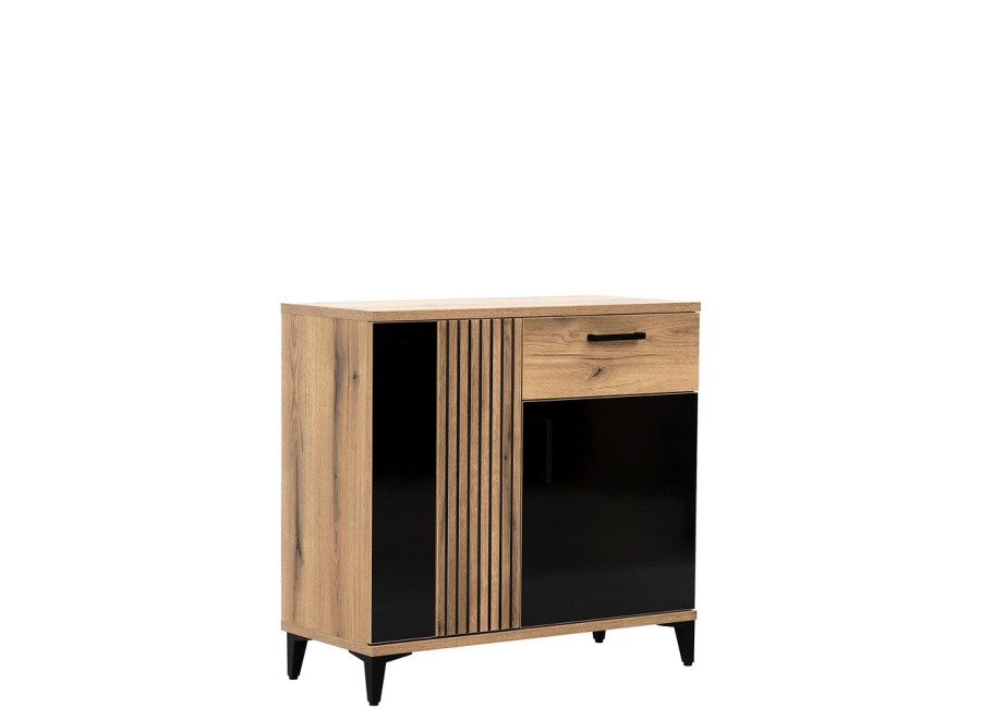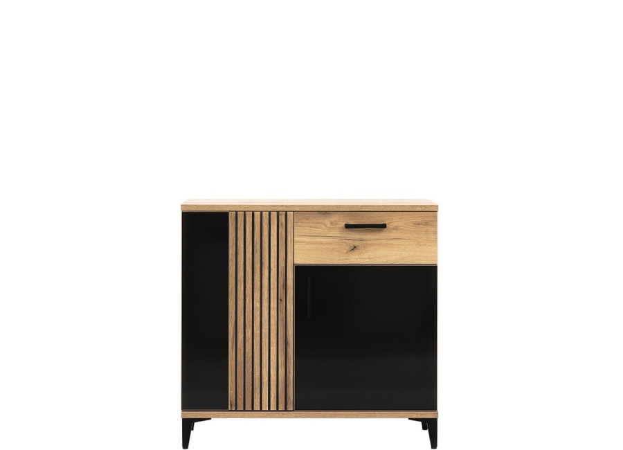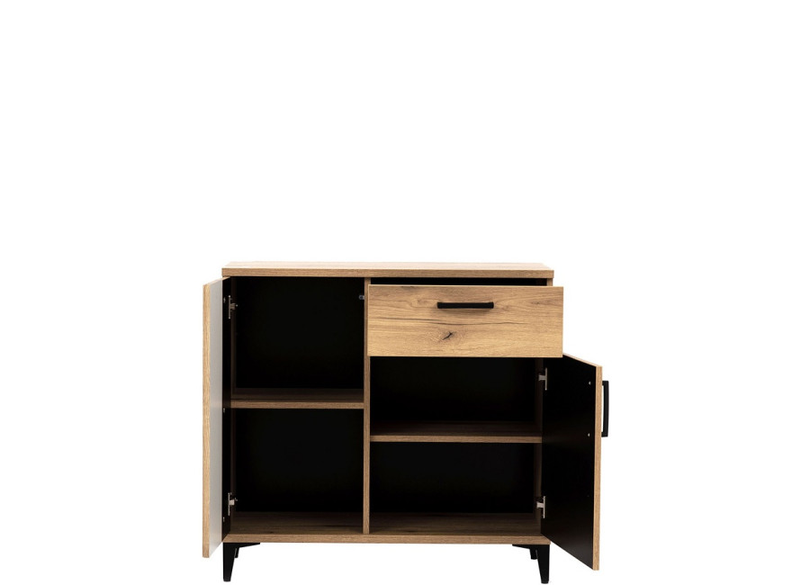 Komoda má 1 zásuvku s guľôčkovými výsuvmi GTV, ktoré umožňujú plný výsuv, a dvomi dvierkami, za ktorými sa nachádzajú štyri praktické úložné priestory.