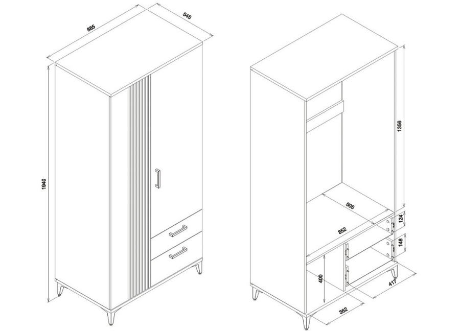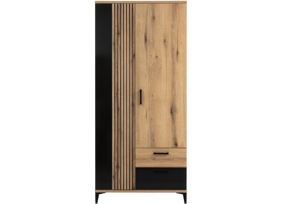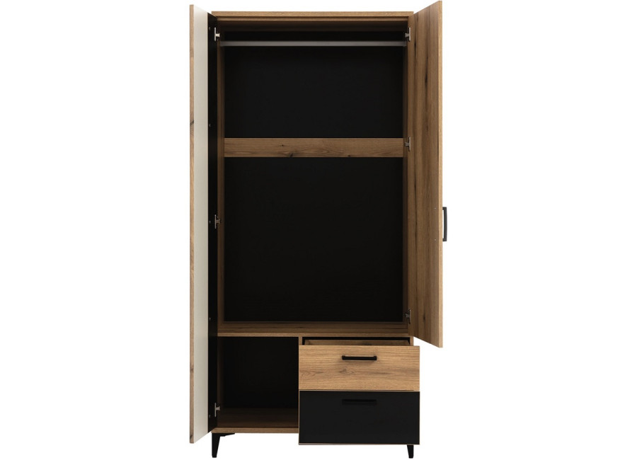 Šatníková skriňa obsahuje dve zásuvky vybavené spoľahlivými guľôčkovými výsuvmi GTV s plnovýsuvom, ktoré zabezpečujú plynulý a jednoduchý prístup k uloženým veciam. Okrem toho disponuje dvomi dvierkami, za ktorými sa nachádza praktická tyč na zavesenie oblečenia. Dvierka sú vybavené integrovaným systémom tichého zatvárania, ktorý je súčasťou pántov. Tento mechanizmus umožňuje jemné a nehlučné zatváranie, čím nielen zvyšuje komfort pri každodennom používaní, ale zároveň predlžuje životnosť celého nábytku.