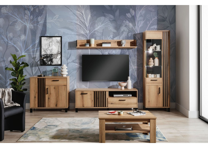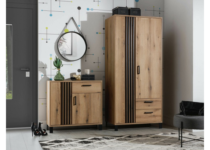 Nábytok NOEL je kvalitný a štýlový nábytok vhodný do obývacej izby a jedálne. Kolekcia kombinuje príjemnú farbu dreva dub evoke a čierne pásiky na dvierkach, ktoré pripomínajú obľúbené lamely. Štýl nábytku NOEL dodávajú čierne úchytky a čierne nožičky, ktoré uľahčujú upratovanie.