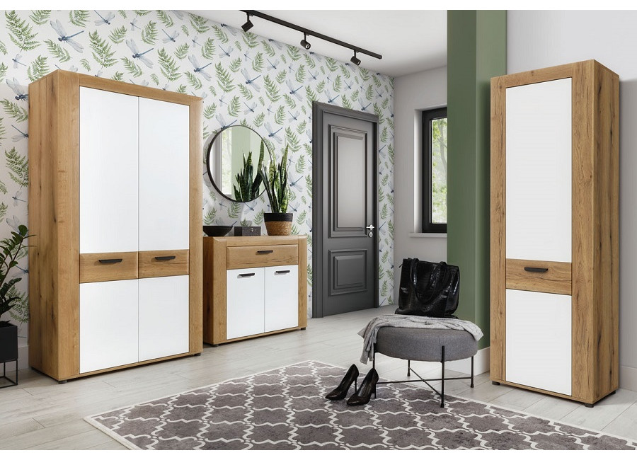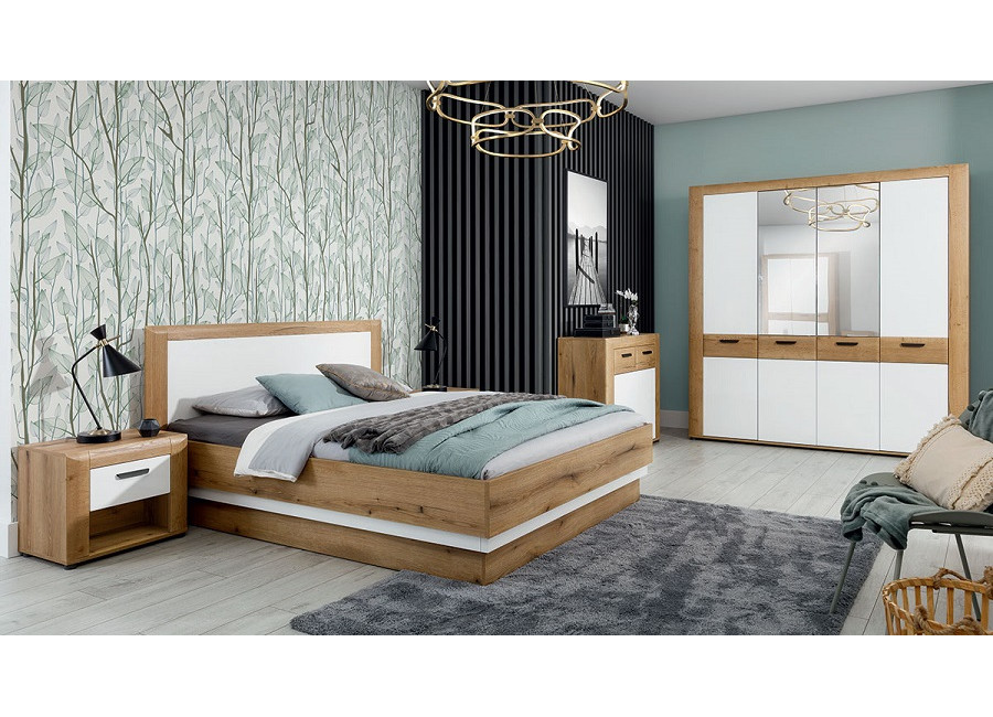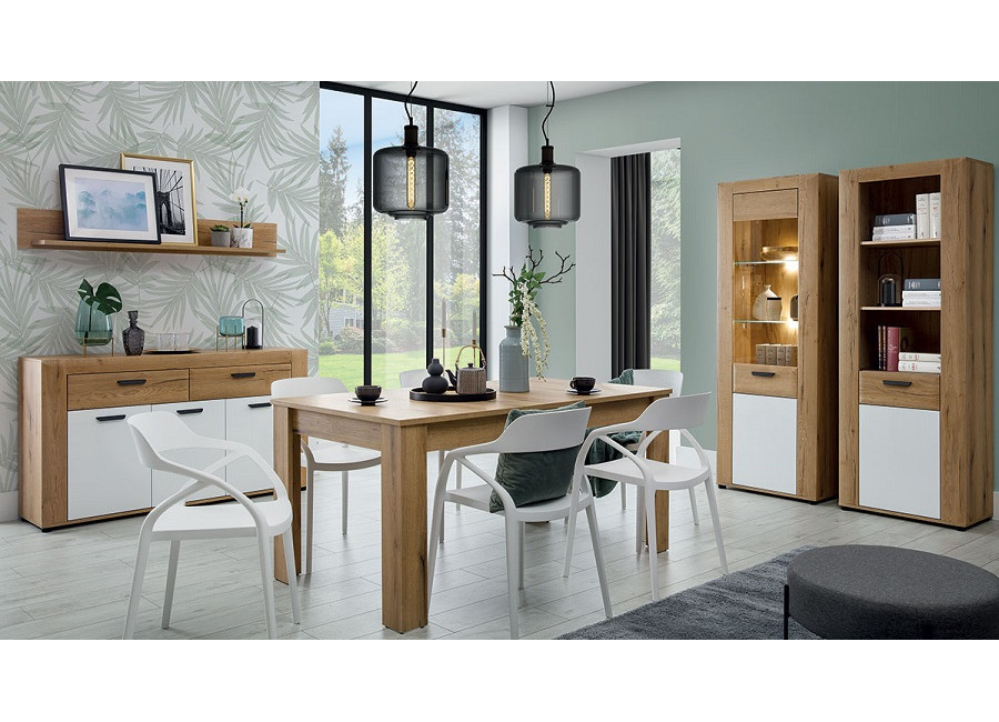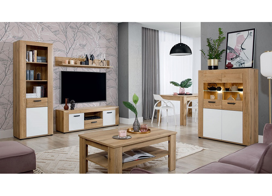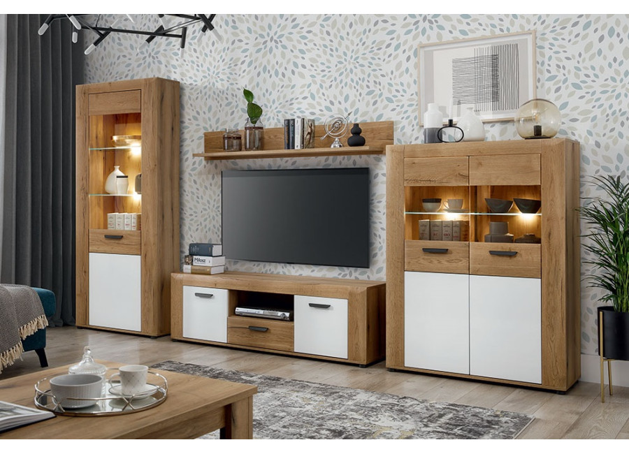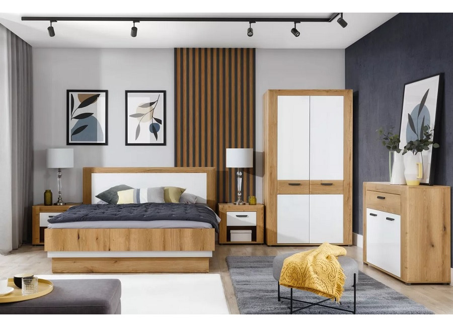 Nábytok BESTO-KRONOS je kvalitný a štýlový nábytok vhodný do obývacej izby a spálne. Kolekcia kombinuje príjemnú farbu dreva dub evoke a biely lesk na MDF dvierkach. Masívny dizajn nábytku NOEL dodáva lemovanie skriniek. Vyrába sa z laminovanej drevotriesky v hrúbke 1,6 cm.