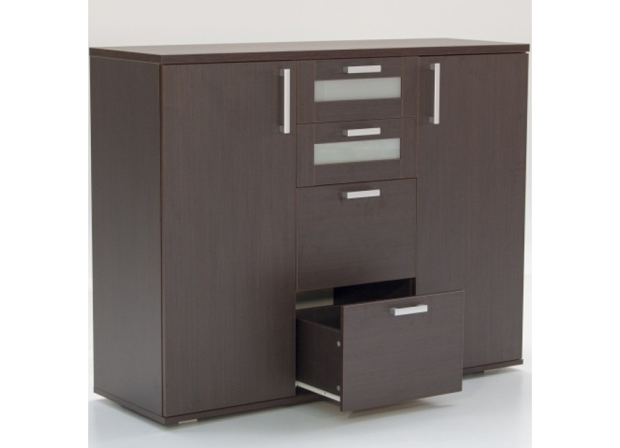 Praktická komoda REA OTTAWA UP 3 je zvislo rozdelená na tri časti. Ľavá a pravá časť je uzatvárateľná dvierkami do strán, pod ktorými sa nachádzajú vždy dve poličky. Stredná časť je doplnená aj praktickými šuflíkmi, pričom vrchné dva šuflíky sú kombinované s mliečnym plexisklom. Univerzálna komoda so šuflíkmi je určená do každej miestnosti - do spálne, do obývačky, do detskej izby, do predsiene alebo do haly. Komoda do spálne je vyrobená z kvalitnej laminovanej drevotrieskovej dosky. Použité hladké a tiché kovanie na šuflíkoch komody vysunie celú zásuvku.