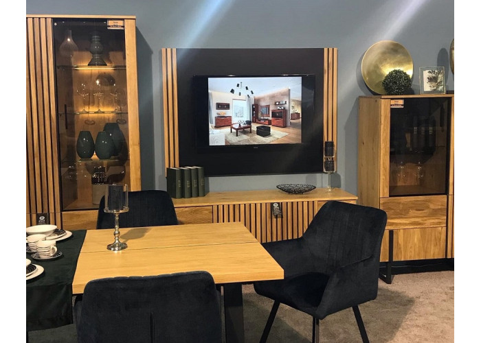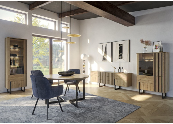 Kolekcia nábytku GINTARO zahŕňa najnovšie dizajnové trendy. Jej výrazným prvkom sú lamely na dvierkach a čierne kovové nohy. Je vhodná na zariadenie obývacej izby alebo jedálne. Predné plochy (dvierka a čielka zásuviek) sú vyrobené z masívneho dreva, korpusy skrinky sú z dýhovanej a klasickej drevotriesky. Otváranie dvierok a zásuviek je systémom Push to open. Vybrať si môžete z mnohých sektorových skriniek. Kolekcia Gintaro je spojením inovatívneho dizajnu s funkčnosťou a dokonalým spracovaním.