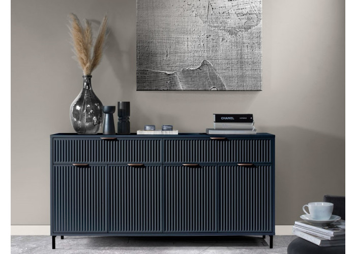 Nábytok LINKaSTYLES vo farbe indigo je vhodný pre ľudí, ktorí radi kombinujú farby a štýly. Nábytok je zdobený vzorom na dvierkach, v podobe frézovaných drážok. Kovové nožičky majú čiernu farbu, úchytky sú v medenom farebnom prevedení.