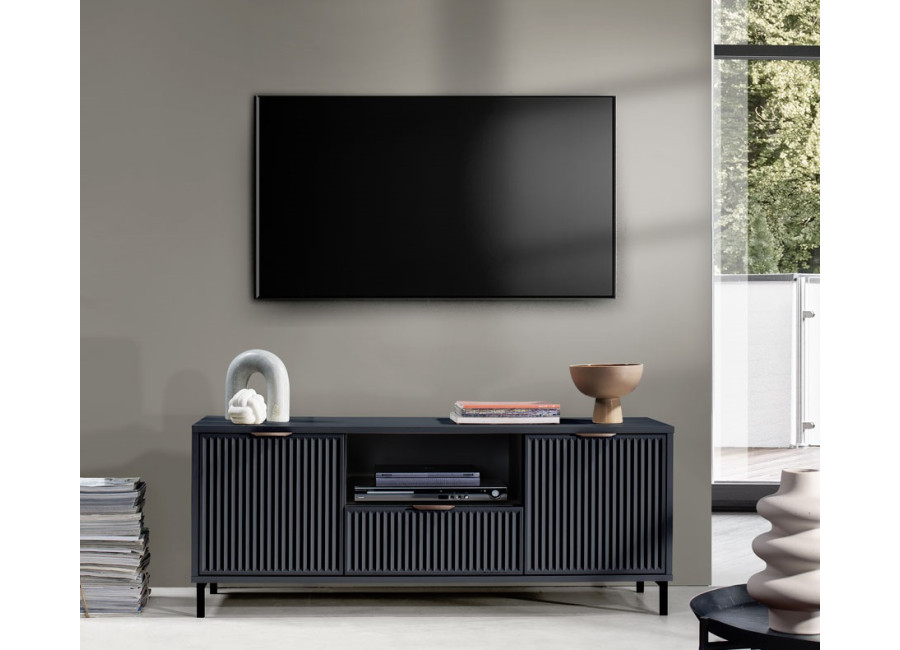 Nábytok LINKaSTYLES vo farbe indigo je vhodný pre ľudí, ktorí radi kombinujú farby a štýly. Nábytok je zdobený vzorom na dvierkach, v podobe frézovaných drážok. Kovové nožičky majú čiernu farbu, úchytky sú v medenom farebnom prevedení.