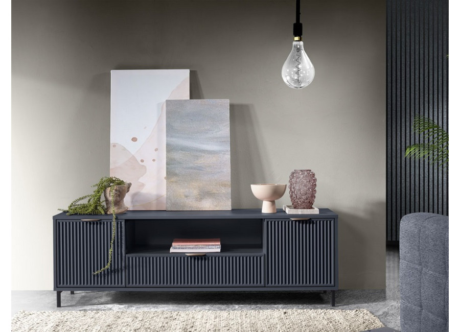 Nábytok LINKaSTYLES vo farbe indigo je vhodný pre ľudí, ktorí radi kombinujú farby a štýly. Nábytok je zdobený vzorom na dvierkach, v podobe frézovaných drážok. Kovové nožičky majú čiernu farbu, úchytky sú v medenom farebnom prevedení.