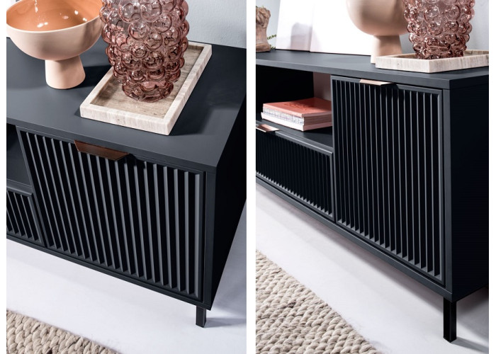 Nábytok LINKaSTYLES vo farbe indigo je vhodný pre ľudí, ktorí radi kombinujú farby a štýly. Nábytok je zdobený vzorom na dvierkach, v podobe frézovaných drážok. Kovové nožičky majú čiernu farbu, úchytky sú v medenom farebnom prevedení.
