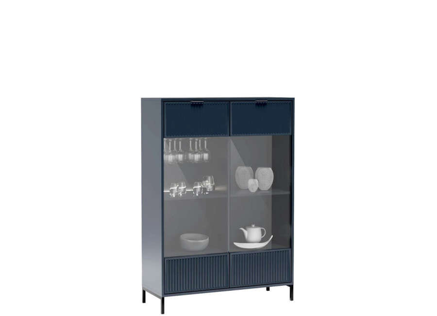 Nábytok LINKaSTYLES vo farbe indigo je vhodný pre ľudí, ktorí radi kombinujú farby a štýly. Nábytok je zdobený vzorom na dvierkach, v podobe frézovaných drážok. Kovové nožičky majú čiernu farbu, úchytky sú v medenom farebnom prevedení.