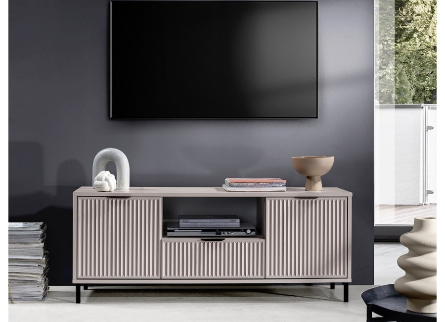 Nábytok LINKaSTYLES vo farbe cashmire je vhodný pre ľudí, ktorí radi kombinujú farby a štýly. Nábytok je zdobený vzorom na dvierkach, v podobe frézovaných drážok. Kovové nožičky majú čiernu farbu, úchytky sú v tmavom farebnom prevedení.