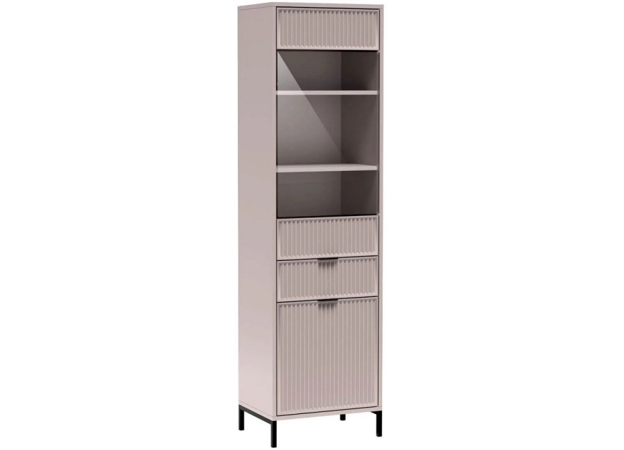 Nábytok LINKaSTYLES vo farbe cashmire je vhodný pre ľudí, ktorí radi kombinujú farby a štýly. Nábytok je zdobený vzorom na dvierkach, v podobe frézovaných drážok. Kovové nožičky majú čiernu farbu, úchytky sú v tmavom farebnom prevedení.