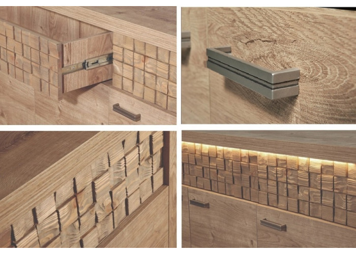 Priaznivcov prírodných úprav a jedinečného dizajnu poteší kolekcia NATURAL. Vyrába sa z kvalitnej laminovanej drevotriesky vo farbe dub ribbeck, má ABS hrany a kovové úchytky. Oceníte tiež dvierka s tichým zatváraním a zásuvky s plnovýsuvom a otváraním Push to Open. Charakteristickým prvkom tejto kolekcie je masívna ozdobná lišta, ktorú môžete podsvietiť LED osvetlením.