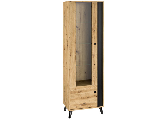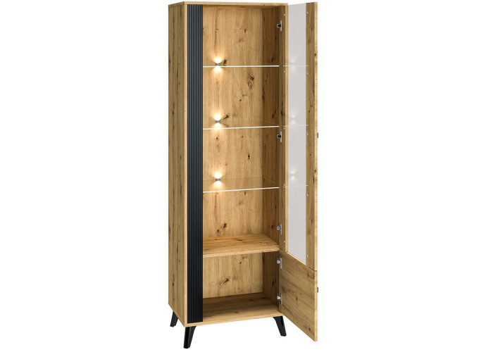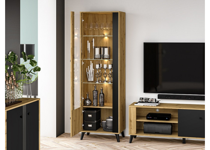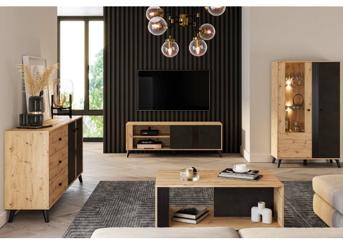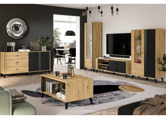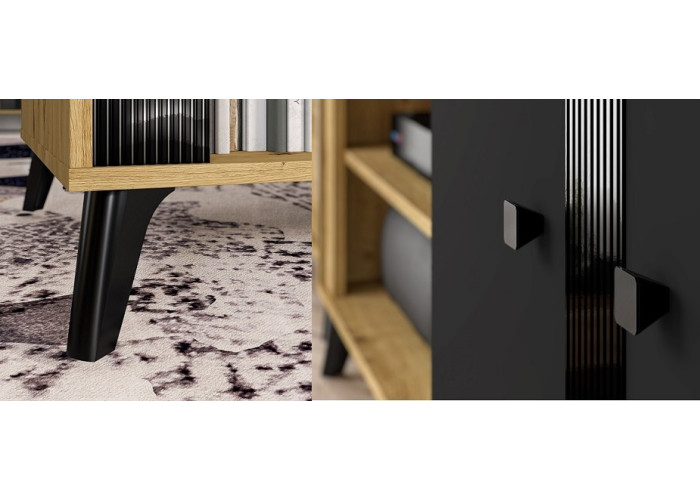 Nábytok ELIZABETH je moderná a elegantná kolekcia sektorového nábytku. Výrazná kombinácia dubu artisan s čiernymi úchytkami a nožičkami je dokonalým riešením zariadenia obývacej izby. Čierne dvierka majú ozdobný pás.