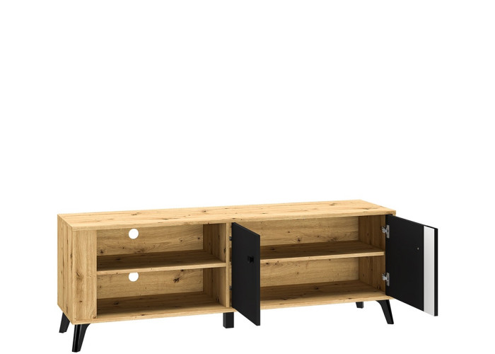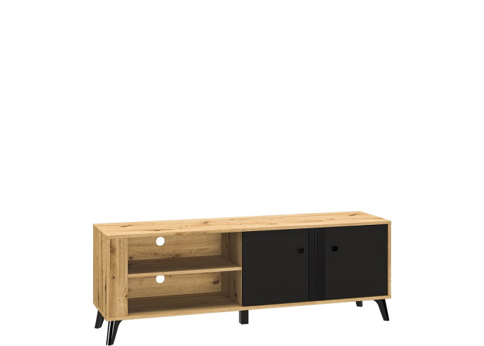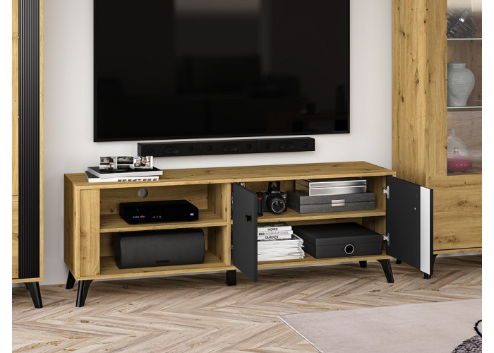 Nábytok ELIZABETH je moderná a elegantná kolekcia sektorového nábytku. Výrazná kombinácia dubu artisan s čiernymi úchytkami a nožičkami je dokonalým riešením zariadenia obývacej izby. Čierne dvierka majú ozdobný pás.