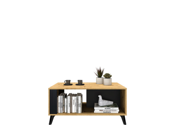 Nábytok ELIZABETH je moderná a elegantná kolekcia sektorového nábytku. Výrazná kombinácia dubu artisan s čiernymi úchytkami a nožičkami je dokonalým riešením zariadenia obývacej izby. Čierne dvierka majú ozdobný pás.