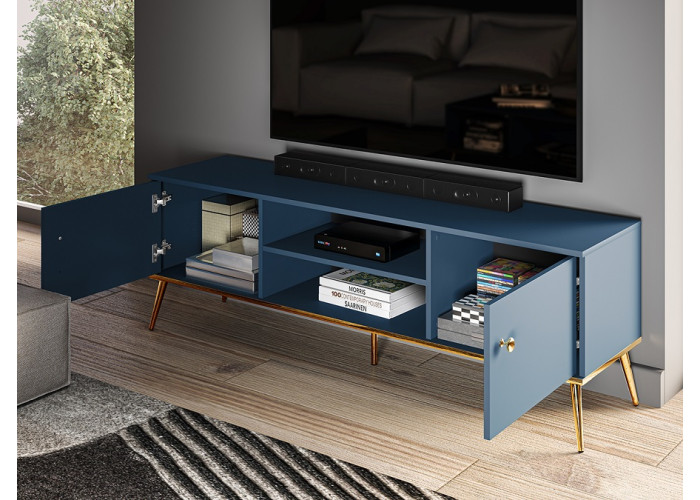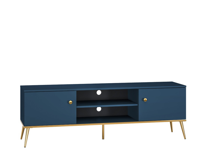 MARINE je jedinečný nábytok, ktorý vnáša do interiéru eleganciu a luxus. Tmavomodrá farba v kombinácií so zlatými detailami dodáva celému systému tajomný a elegantný charakter. Úchytky a nožičky sú kovové, dvierka majú závesy s tichým zatváraním.