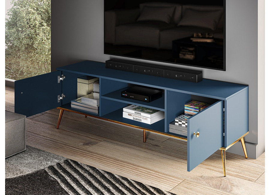 MARINE je jedinečný nábytok, ktorý vnáša do interiéru eleganciu a luxus. Tmavomodrá farba v kombinácií so zlatými detailami dodáva celému systému tajomný a elegantný charakter. Úchytky a nožičky sú kovové, dvierka majú závesy s tichým zatváraním.